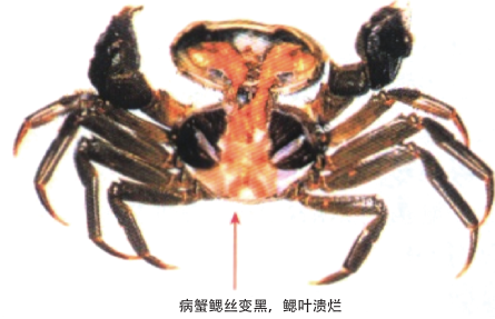 【症状】病蟹发病初期鳃丝暗褐色,随病情发展变成黑色,病蟹行动迟缓,呼吸困难出现叹气状。